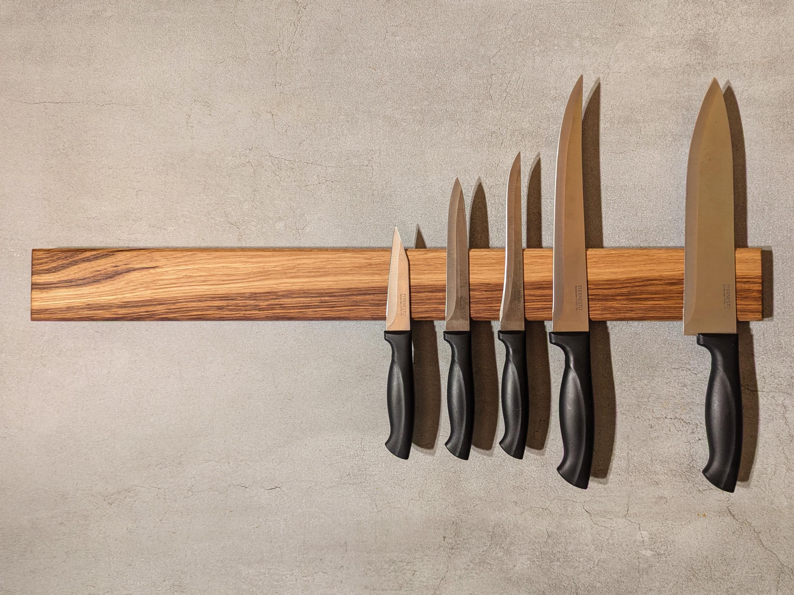 Schöne magnetische Messerleiste aus massiver Eiche – handgefertigt, stark magnetisch - perfekt für moderne Küchen! Unsichtbare Neodym-Magnete halten Messer aller gängigen Größen sicher fest. Das lebensmittelechte Öl-Finish sorgt für einen seidenmatten Glanz und hebt die warme Eichenfarbe besonders schön hervor.