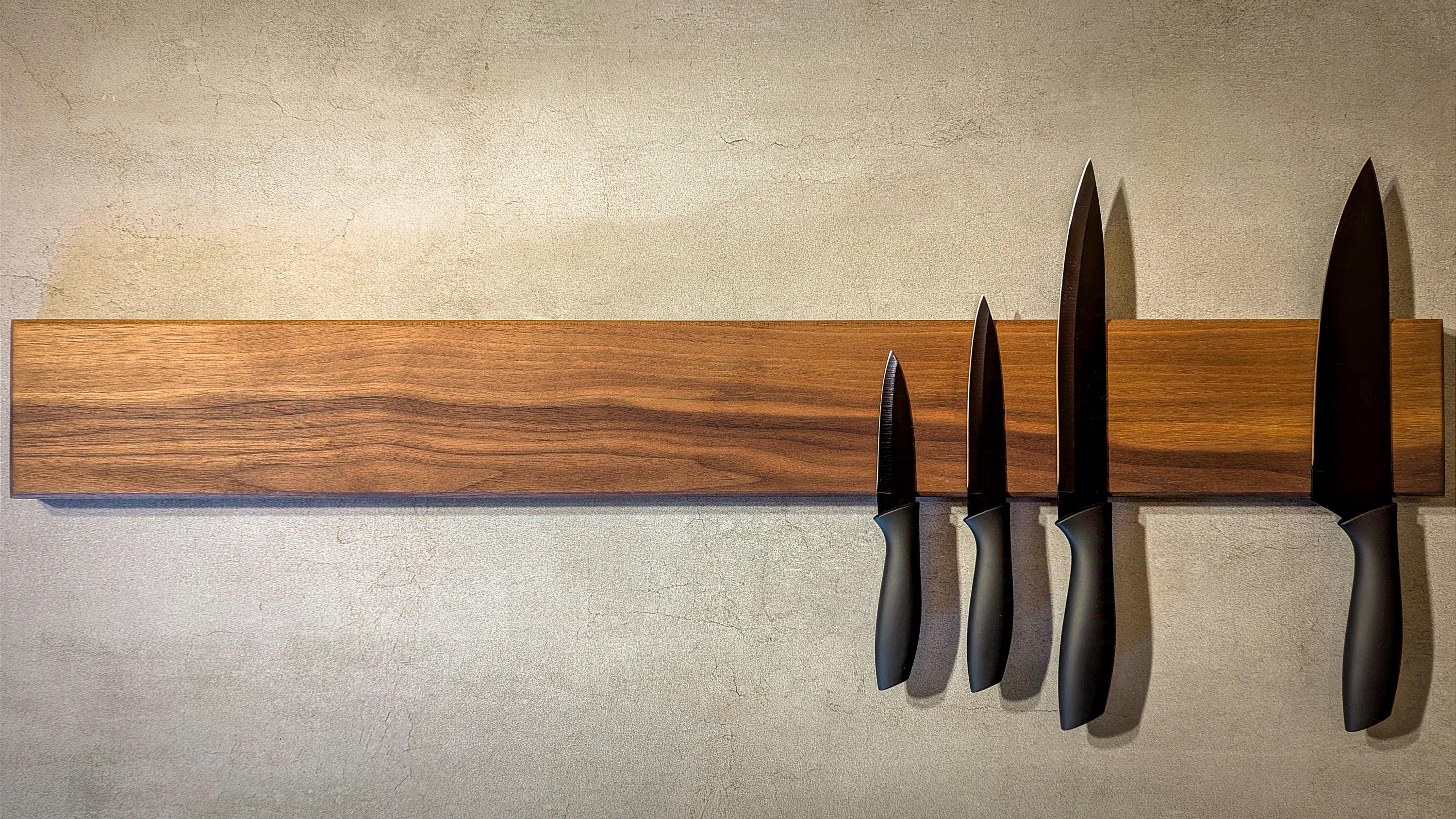 Elegante Messerleiste aus gedämpfter Walnuss – stark magnetisch, handgefertigt & perfekt für moderne Küchen.